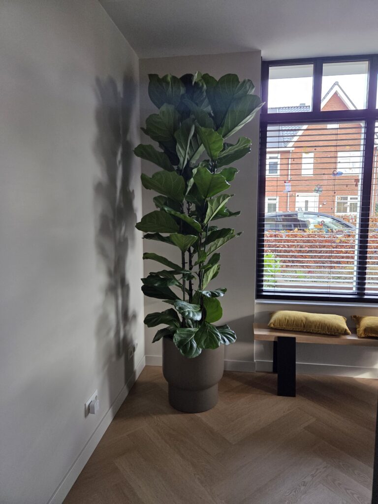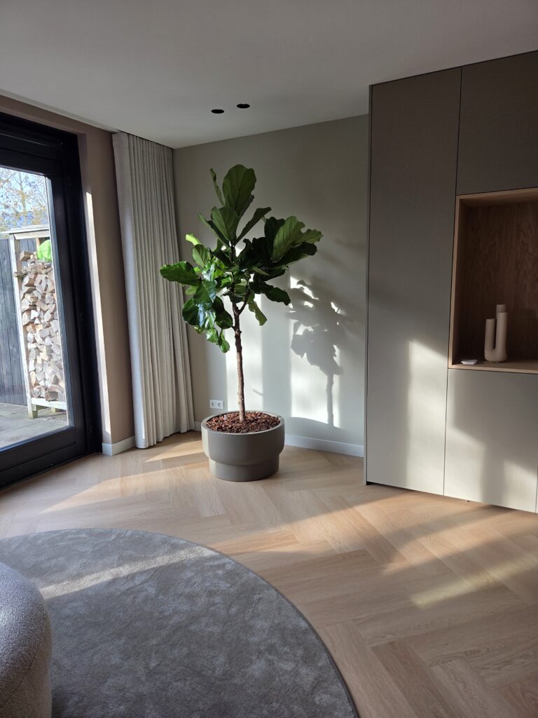 Dezelfde soort als de boom op de vorige foto, maar met een totaal andere uitstraling. Een mooi voorbeeld van hoe je met één plantensoort toch heel verschillende sferen kunt neerzetten. Deze Ficus Lyrata drietaks past precies in de hoek bij de keuken. De drie rechte, slanke stammen groeien elegant omhoog, waardoor de plant weinig ruimte inneemt maar wel veel hoogte en karakter toevoegt. Beide planten staan in dezelfde zichtlijn. Omdat het dezelfde soort is, ontstaat er vanzelf rust en eenheid in het interieur. De herhaling verzacht het geheel en sluit prachtig aan bij de serene sfeer van deze woning.
