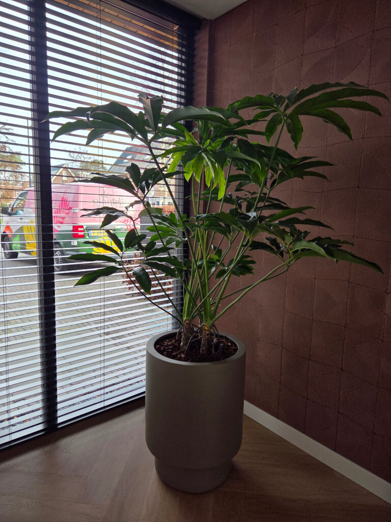 Deze plant/boom, ook wel bekend als tabaks- of vioolplant, is wederom een perfect voorbeeld van een natuurlijk kunstobject: hoog, sculpturaal en vol karakter. Het blad heeft een heel kenmerkende, artistieke vorm. De open kroon laat licht door en houdt de ruimte luchtig, terwijl ze toch duidelijk aanwezig is. Precies de balans waar dit moderne interieur om vraagt.
