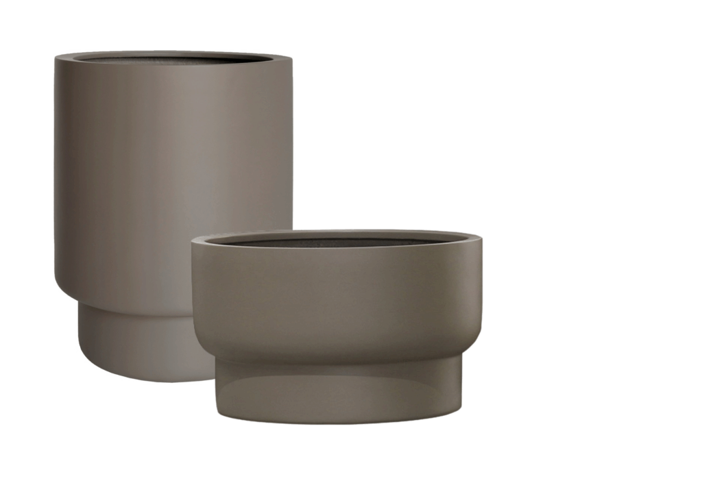 Alle potten komen uit dezelfde lijn van het merk Vase the World. Ze hebben allemaal een warme taupe-tint, maar elk een andere vorm wat het een spannend geheel maakt.