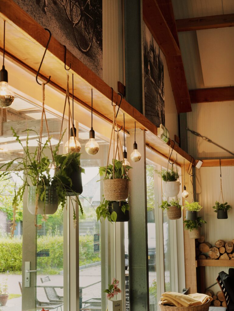 We hebben gekozen voor hangplanten om de hoogte van de ruimte te benutten en een speels, groen effect te creëren. Door planten op ooghoogte én daarboven te plaatsen, ontstaat er een levendige gelaagdheid: alsof je onder een bladerdak zit, zelfs binnen. Het versterkt het buitengevoel en maakt de warme, landelijke sfeer van Hoeve Wielrevelt nog uitnodigender.