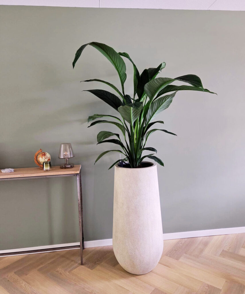 Gelukkig zijn er genoeg alternatieven die wél passen. Op basis van het moodboard is gekozen voor een Spathiphyllum ‘Sensation’. Net als de Strelitzia heeft deze plant groot, sierlijk blad, maar dan een stuk onderhoudsvriendelijker én geschikter voor minder lichte plekken. Een prachtige eyecatcher die zich moeiteloos laat stylen.