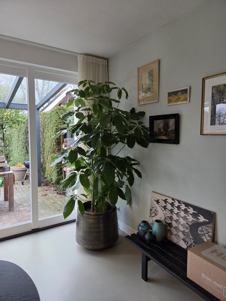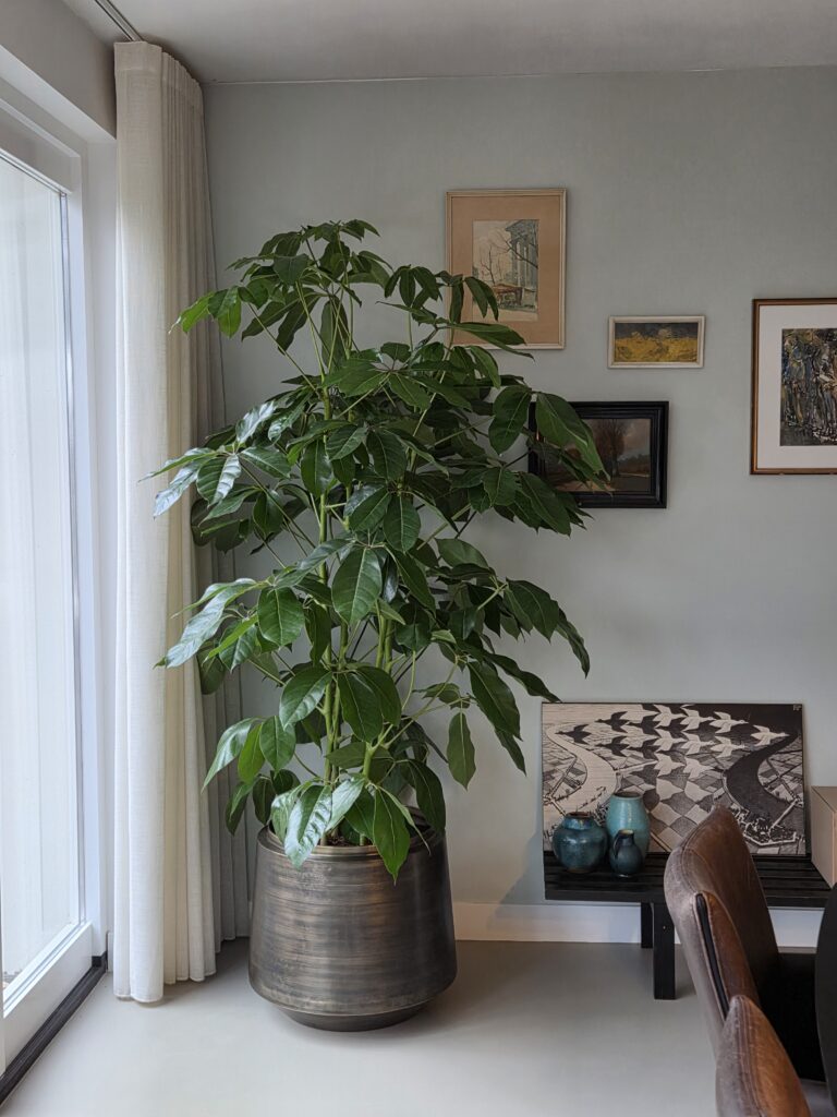 De belangrijkste wens? Eén echte eyecatcher bij de eetkamer. Een grote plant die de ruimte draagt en tegelijkertijd rust brengt. De keuze viel op een Schefflera Amate van 2 meter. Een krachtige, elegante plant die van nature voorkomt in de tropische bossen van Australië. Dankzij haar indrukwekkende hoogte is het een echte blikvanger. Haar slanke stelen en speelse blad geven de plant lucht zodat ze niet teveel overheerst. Ze is geplaatst in een stijlvolle pot van Gina Da, uitgevoerd in geborsteld koper.