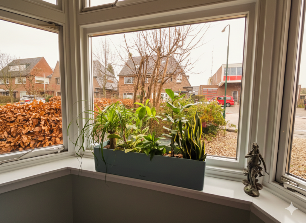 Aan de voorkant van de woonkamer bevindt zich een lichte erker waar de zon de hele dag vrij spel heeft. Dat is prachtig, maar ook een uitdaging. De meeste kamerplanten houden nu eenmaal niet van direct zonlicht. Gelukkig zijn er genoeg soorten die dit juist wél aankunnen. Om het speels en levendig te houden, kozen we voor een selectie van vijf planten: Sansevieria, Beaucarnea, Dracaena surculosa, Clusia rosea en Peperomia. Samen vormen ze een soort tropische binnentuin: verschillend in vorm en blad, maar in balans als geheel. Groen dat leeft, maar ook past bij de ruimte en het licht.